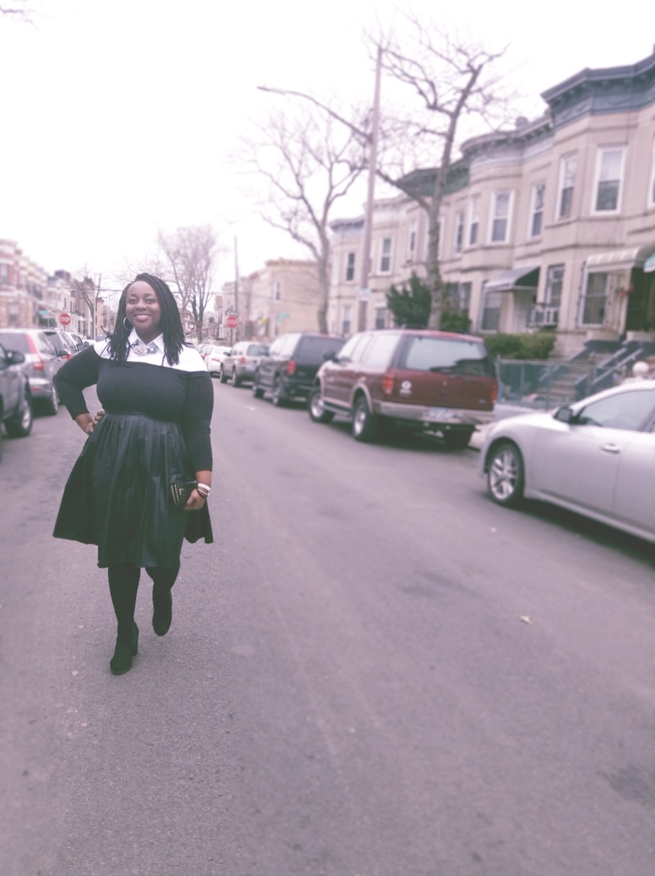 This Ashley Stewart shirt and off-the-shoulder sweater combo top made me feel so chic. This Worthington leather skirt purchased at JCPenney added a touch of class to the outfit. The black clutch and silver-blue necklace were the perfect accessories to complete the look! I cannot forget the black booties that I purchased from Payless(no longer in stores). They are comfortable, sturdy, and it makes my legs look great!